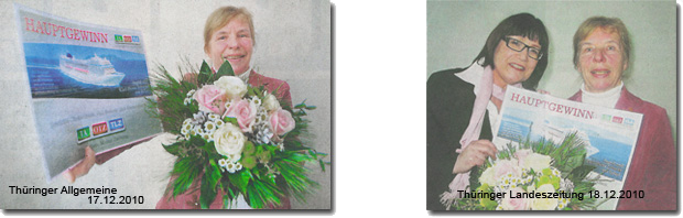 Beim Jahresgewinnspiel 2010 der Zeitungsgruppe Thüringen gewann Ingrid Schacht den Hauptpreis